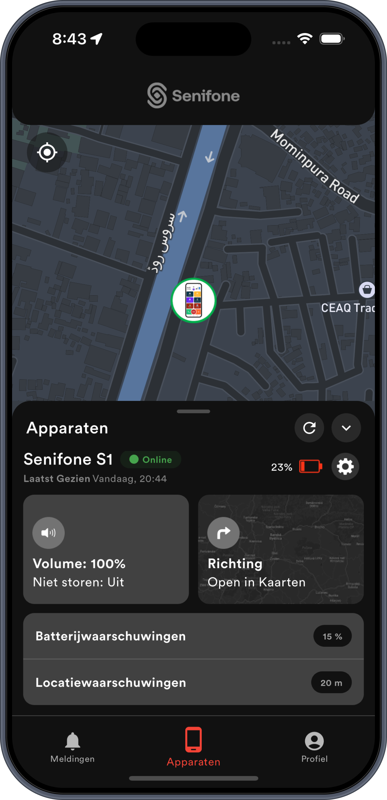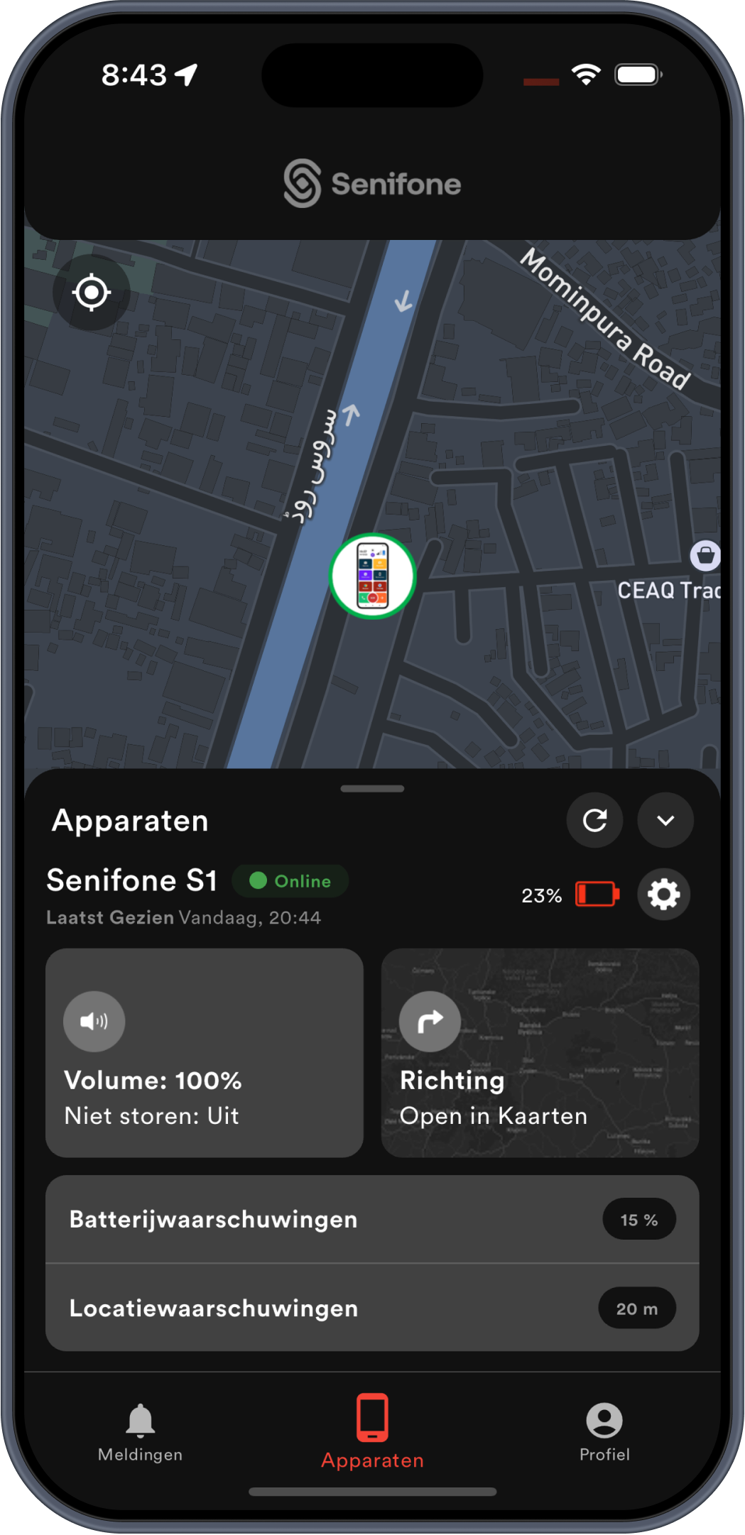Afhankelijk van de configuratie ziet u live locatie, activiteit in veilige zones, batterijniveau, verbindingsstatus en SOS-meldingen van het gekoppelde Senifone-toestel.